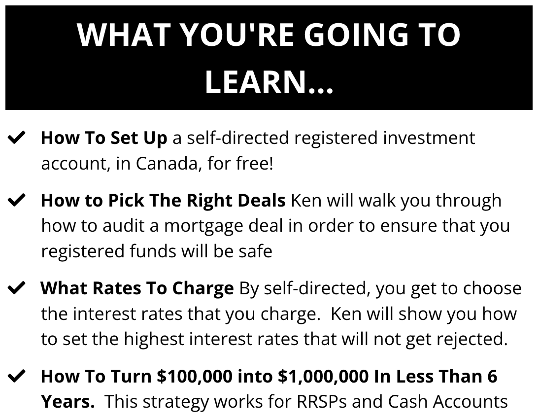 During this webinar, Ken will show you exactly how to lend your cash, RRSP, LIRA & TFSA money out in shortterm,